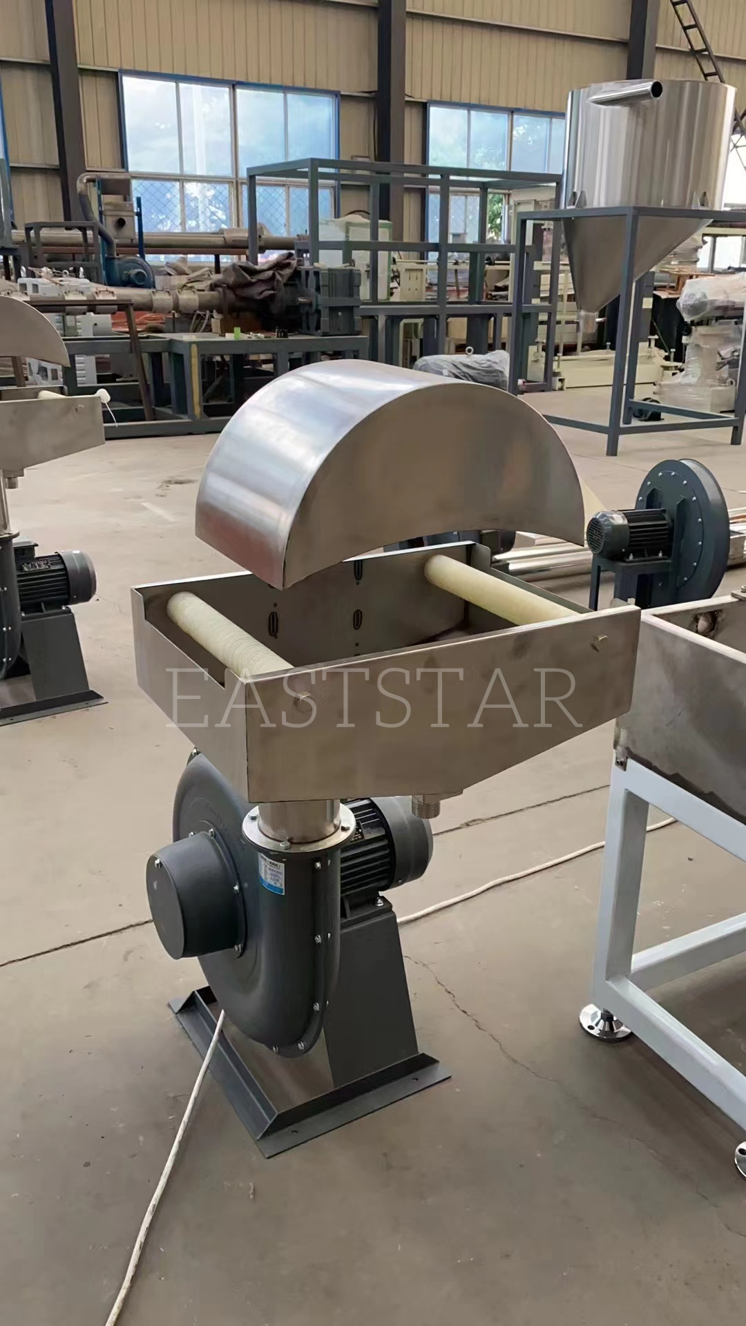 దిసమాంతర ట్విన్-స్క్రూ గ్రాన్యులేటర్2.2kW పవర్ మరియు 17:1 స్పీడ్ రేషియోతో డ్యూయల్-స్పైరల్ మీటరింగ్ ఫీడర్ను కలిగి ఉంటుంది, ఇది స్థిరమైన మెటీరియల్ ఫీడింగ్ను నిర్ధారిస్తుంది. కట్టింగ్ విభాగం కోసం, ప్లాస్టిక్ గ్రాన్యులేషన్ సిస్టమ్ 2.8 మిమీ వ్యాసం కలిగిన 72 రంధ్రాలతో హాట్-కట్ టెంప్లేట్ను ఉపయోగిస్తుంది, రేపియర్ అసెంబ్లీలో నాలుగు కట్టింగ్ బ్లేడ్లతో అనుబంధంగా ఉంటుంది. రెండు అధిక-పీడన బ్లోయర్లు (5.5kW మరియు 4kW) గుళికలను స్టెయిన్లెస్ స్టీల్ పైపింగ్ ద్వారా వేరు మరియు సేకరణ వ్యవస్థలకు సమర్థవంతంగా రవాణా చేస్తాయి.